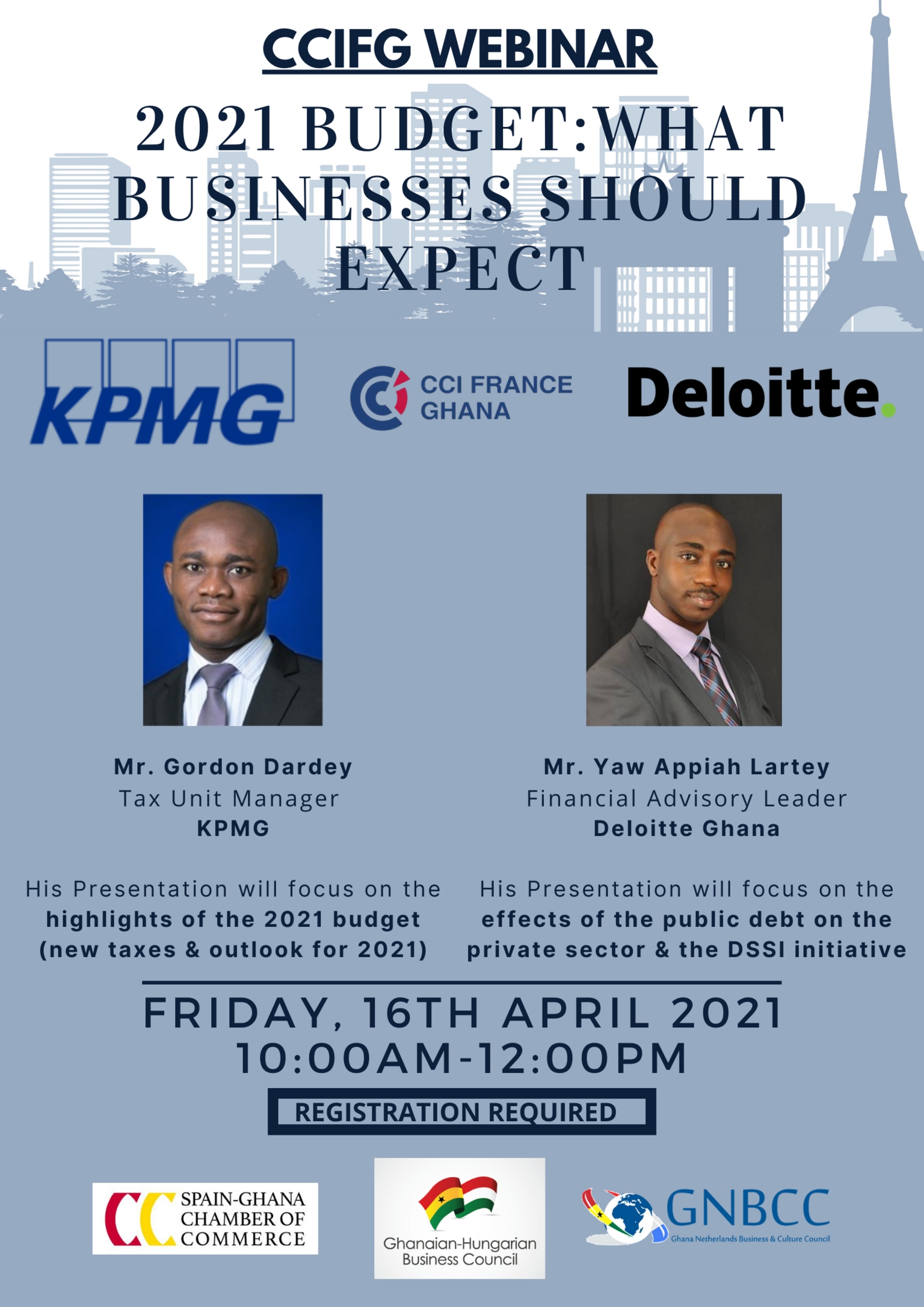 Mr. Gordon Dardey from KPMG & Mr. Yaw Appiah Lartey from Deloitte will lead the conversation on the highlights of the 2021 budget and the effects of the public debt on the private sector & the DSSI initiative.