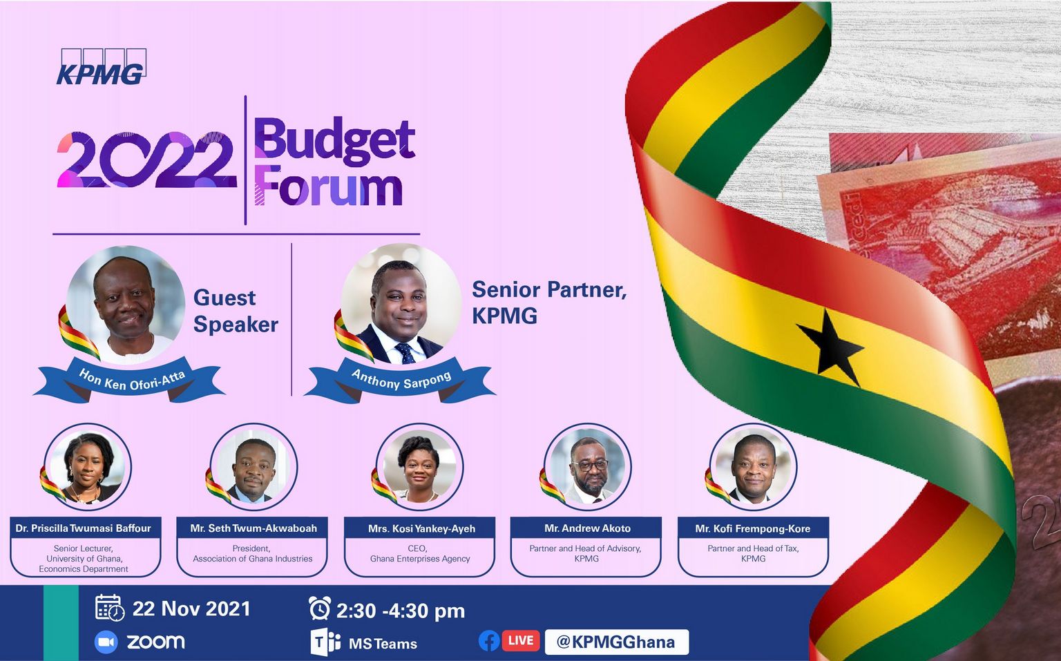 Following the budget reading on 17 November 2021, KPMG is looking forward to having you join us at this year’s Post-Budget Forum scheduled for Monday, 22 November, 2021 from 2:30pm to 4:30pm. The keynote speaker will be the Honourable Minister for Finance, Hon. Ken Ofori-Atta. Joining him on the panel will be Mrs. Kosi Yankey-Ayeh, CEO of Ghana Enterprises Agency, Dr. Priscilla Twumasi Baffour, Senior Lecturer of Economics, University of Ghana, Mr. Seth Twum Akwaboah, Chief Executive Officer, Association of Ghana Industries, Mr. Kofi Frempong-Kore, Partner, Tax, KPMG with Mr. Andy Akoto, as moderator. Kindly see below links to joining the event live on Facebook, Microsoft Teams and Zoom. Facebook: https://fb.me/e/1ukR1IVjK Microsoft Teams: https://bit.ly/3Fv8fvZ Zoom: https://bit.ly/3oCKKu8 (Meeting ID: 894 9003 8586 Passcode: 504878)
