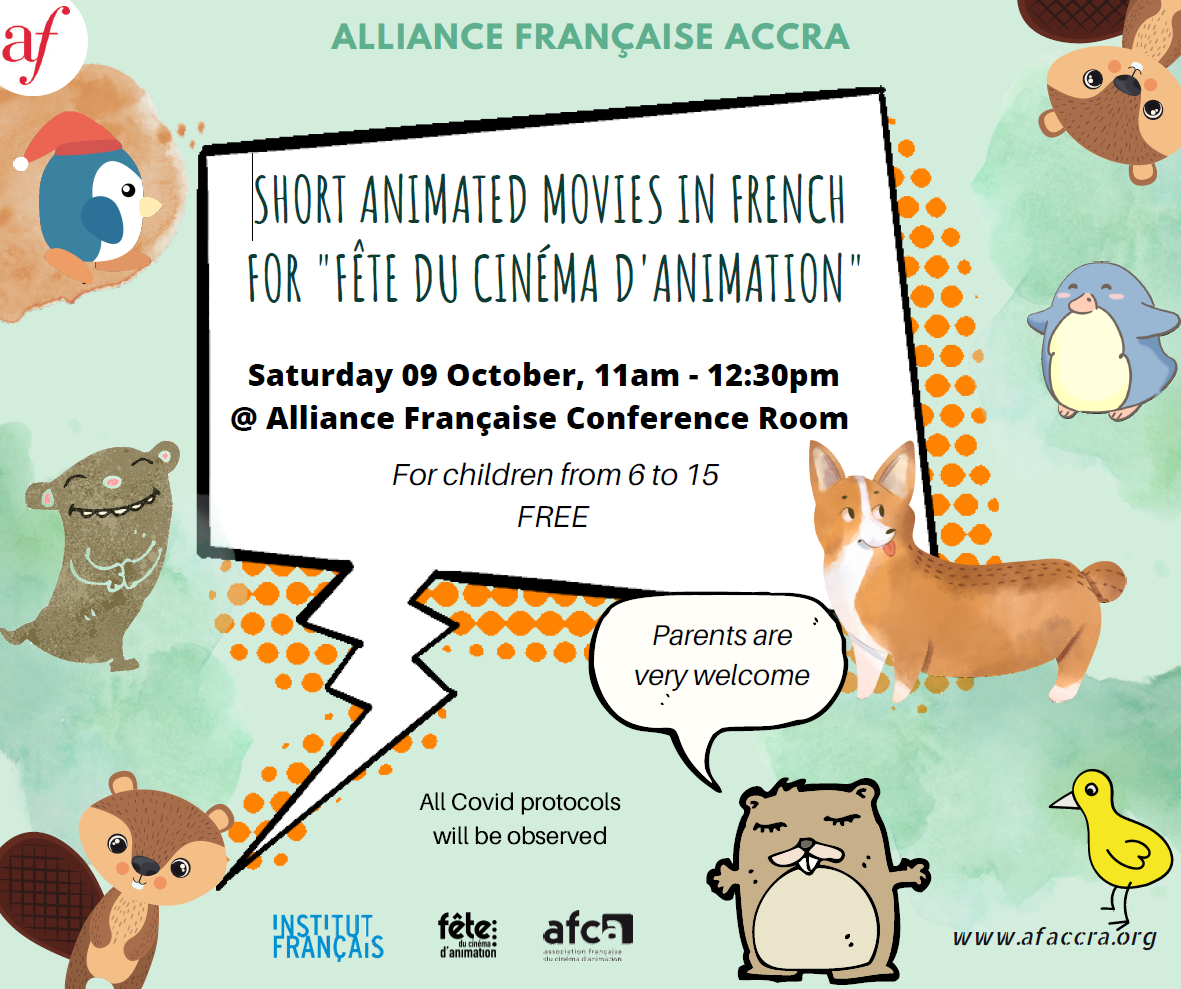 This event will take place on October 09, 2021 from 11:00 am to 12:30 pm at Alliance Française d'Accra with the screening of 6 short animated films selected from European festivals.