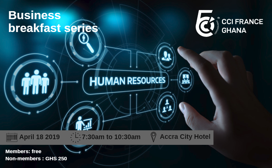 The CCI France Ghana is organising a Business Breakfast on Human Resources and its legal approach on 18th of April 2019 at the Accra City Hotel from 07:30am to 10:30am.