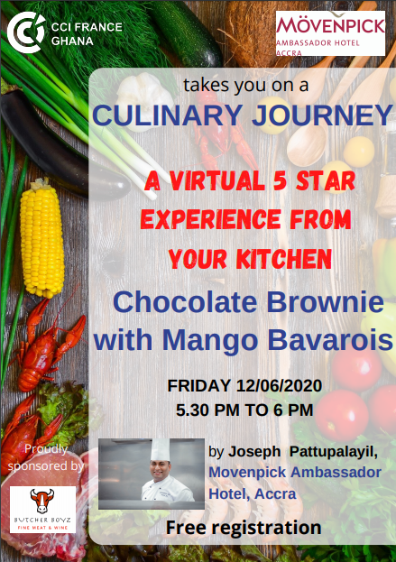CCI France Ghana innovates and invites its CCIFG members, families and friends to a weekly virtual cooking class in the comfort of your own kitchen, hosted by Accra 5 star Hotel Chefs!
