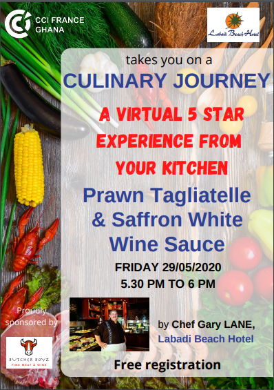 CCI France Ghana innovates and invites its CCIFG members, families and friends to a weekly virtual cooking class in the comfort of your own kitchen, hosted by Accra 5 star Hotel Chefs!