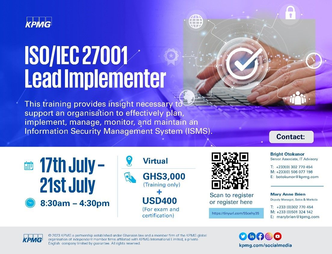 The ISO/IEC 27001 Lead Implementer training course enables participants to acquire the knowledge necessary to support an organisation to effectively plan, implement, manage, monitor, and maintain an information security management system (ISMS). With information security threats and attacks on the rise, the best form of defence is the proper implementation and management of information security controls and best practices. Information security is also a key expectation and requirement of customers, legislators, and other interested parties. This training is ideal for project managers and consultants involved in and concerned with the implementation of an ISMS, expert advisors seeking to master the implementation of an ISMS, individuals responsible for ensuring conformity to information security requirements within an organisation and members of an ISMS implementation team and is designed to prepare participants to implement an information security management system (ISMS) based on ISO/IEC 27001. For more information on this training, kindly see the flier.