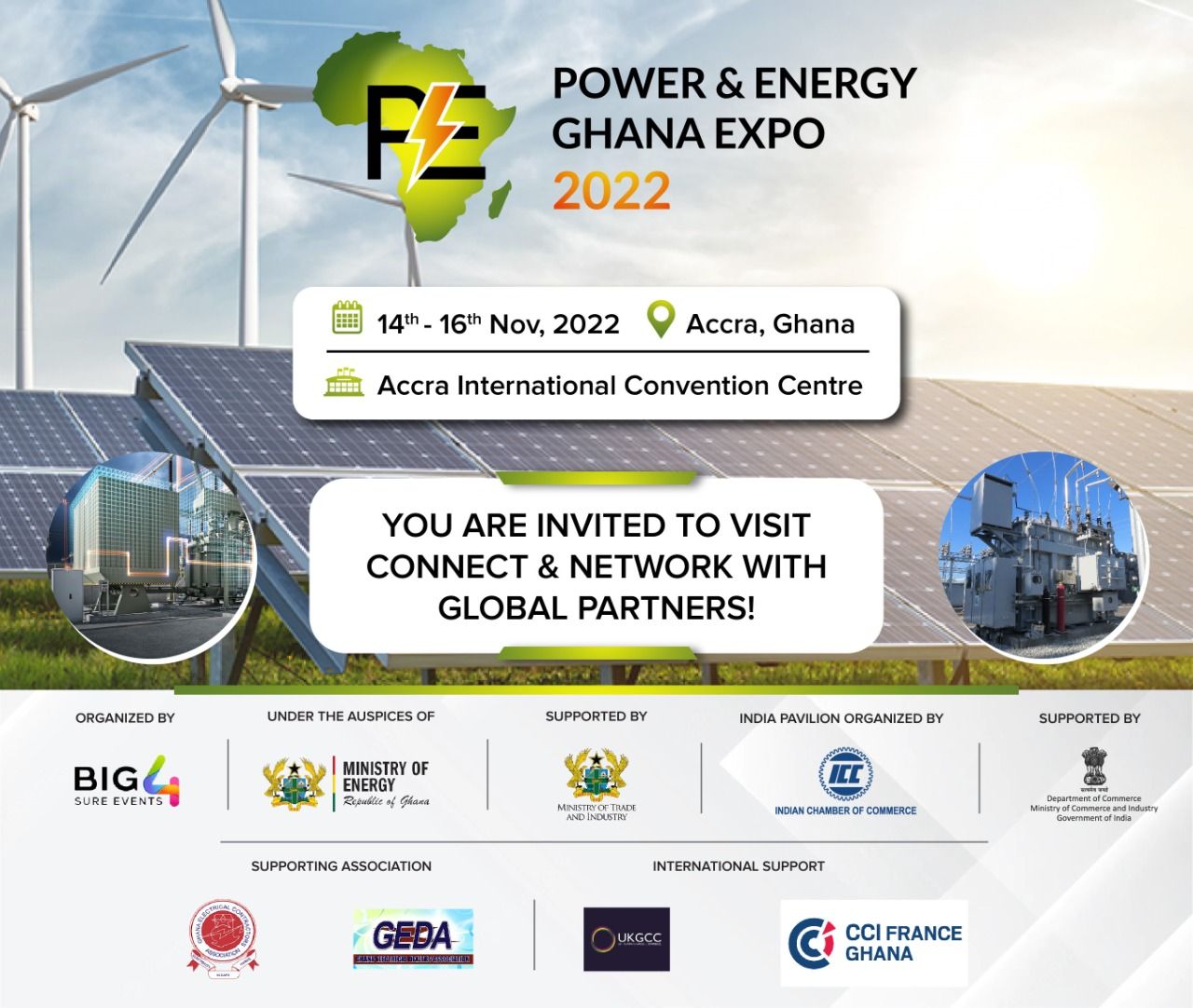 We are glad to inform you that, BIG4SURE EVENTS FZCO is organizing the Power Energy Ghana Expo in Accra International Conference Centre, Ghana from 14-16 Nov 2022, under the Auspices of Ministry of Energy and with Support of Ministry of Trade of Ghana and also with support of GECA, GEDA, AGI, GNCCI, CCIFG and UKGCC.