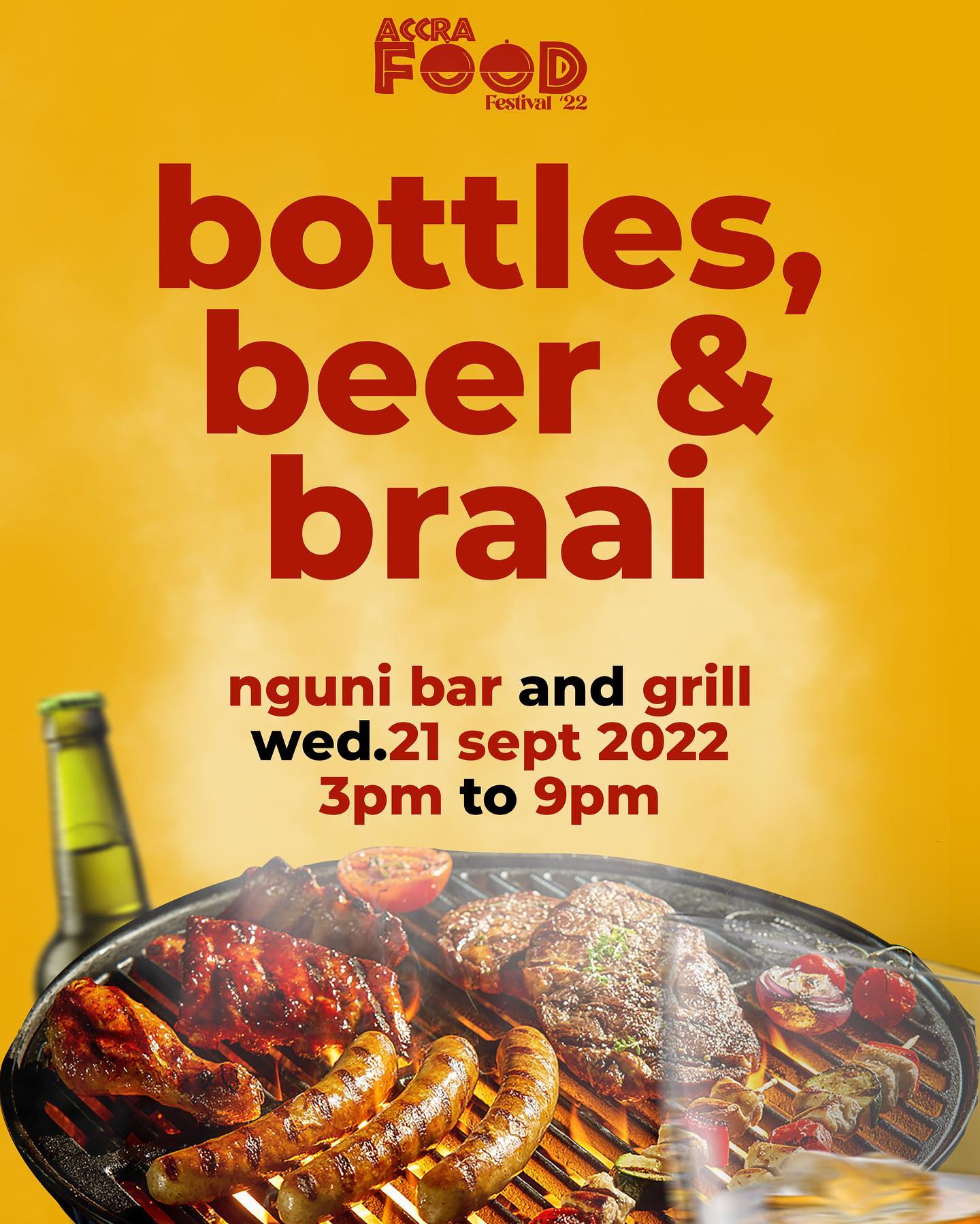 Bottles, Beer, & Braai - Wednesday 21 September 2022, Nguni Bar & Grill ~ kicks off the Accra Food Festival Week, brought to you by CLUB Beer and KWV Wines, spend the holiday with friends at this outdoor BBQ Bash. Taste, Learn, & Experience authentic South African Braai from Nguni Braai Master Chef Sebastian. Enjoy crisp cold CLUB Beer, creative cocktails, and classics.