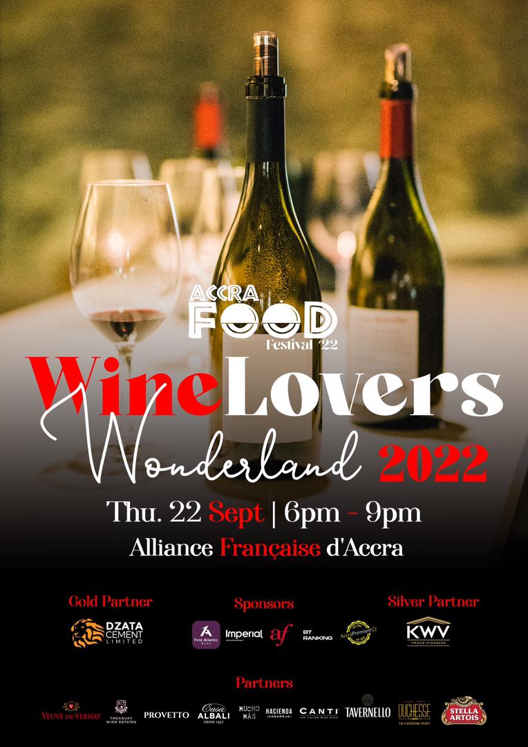 Wine Lovers Wonderland - Thursday 22 September, 2022, Alliance Française d’Accra ~ AccraPremium returns to Alliance Française d’Accra for an evening of Wine, Canapés, & Entertainment. “Wine Lovers Wonderland” celebrates the Top Wines in Accra, bringing them all together for one special night. Experience wines from around the world such as; Veuve du Vernay (France), Provetto (Spain), Treasury Wine Estates (Australia), KWV (South Africa), Mucho Mas (Spain) & More. Enjoy Live Jazz Performances by Liv North, OwuraSax, & Sounds by DJ Dirty Cursive. Toast under the stars as we build excitement for the 9th Accra Food Festival.