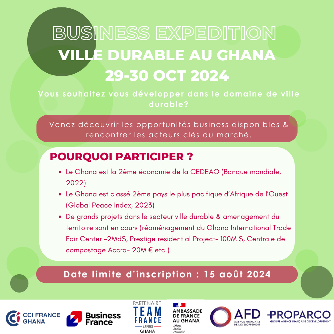 Notre expédition commerciale sur le thème de la Ville Durable a pour but de présenter le potentiel commercial du Ghana en s’attardant sur les opportunités existantes ainsi que les défis auxquels le pays fait face. La présence d’experts institutionnels français comme ghanéens, d’acteurs du secteur privé mais aussi financiers permettra aux participants d’appréhender plus précisément le domaine de la ville durable. Des réunions B2B sont également prévus pour permettre aux participants de rencontrer des partenaires potentiels.