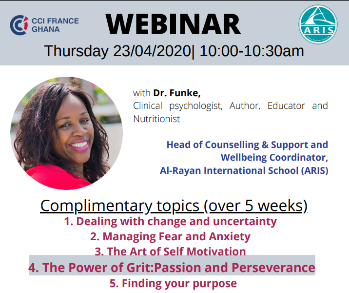 Speaker: Dr Funke Baffour-Awuah, clinical psychologist, author, educator and nutritionist. Head of Counselling & Support and the Wellbeing Coordinator, Al-Rayan International School, Ghana (ARIS)
