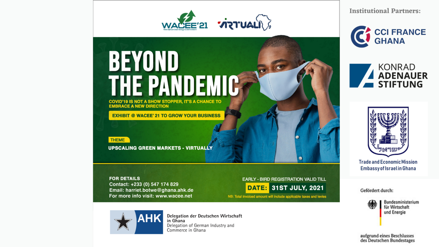 The Delegation of German Industry and Commerce in Ghana (AHK Ghana) is organising its flagship event, the West African Clean Energy and Environment Trade and Conference (WACEE) on the 29th & 30th September 2021. WACEE has over the years created an avenue for relevant conversation on the growth of Clean Energy, Water, and Circular Economy in Ghana since its conception in 2012.