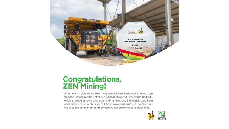 ZEN has been named Best Performer in Mine Supplies and Services at the just ended Ghana Mining Industry Awards organised by The Ghana Chamber of Mines