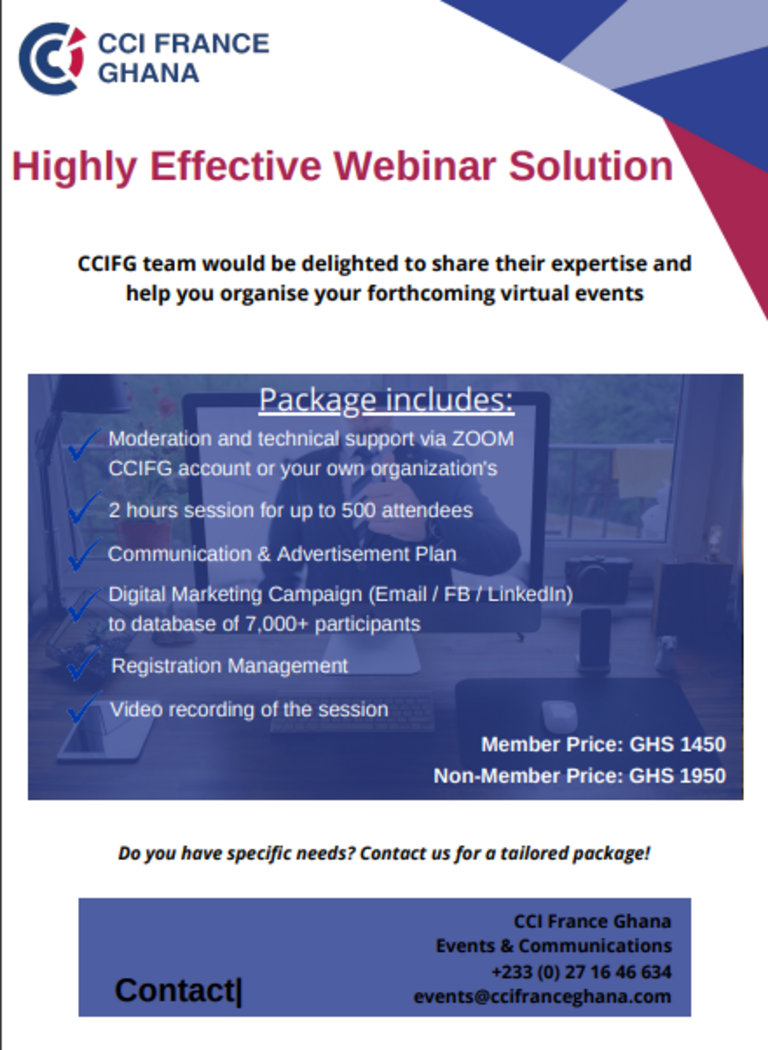 Through its activities locally and abroad CCIFG continues to contribute significantly to the global rising of activities in the France in Ghana network as well as to the benefits of its internal network made up of more than 110 members from diverse sectors in Corporate Ghana.