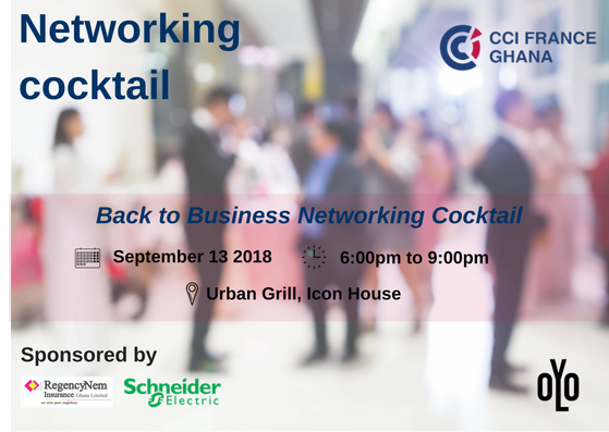 CCI France Ghana in partnership with RegencyNem Insurance Ghana Ltd and Schneider Electric Ghana International is organizing the CCIFG's signature Back to Business Networking Cocktail on the 13th of September, 2018 at Urban Grill located at ICON House from 6:00pm to 9:00pm.