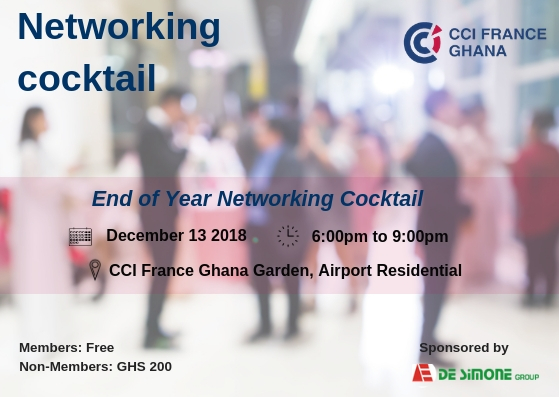CCI France Ghana in collaboration with De Simone Group is organising its End of Year Networking Cocktail on the 13th of December, 2018 at the CCIFG Garden from 6:00pm to 9:00pm.