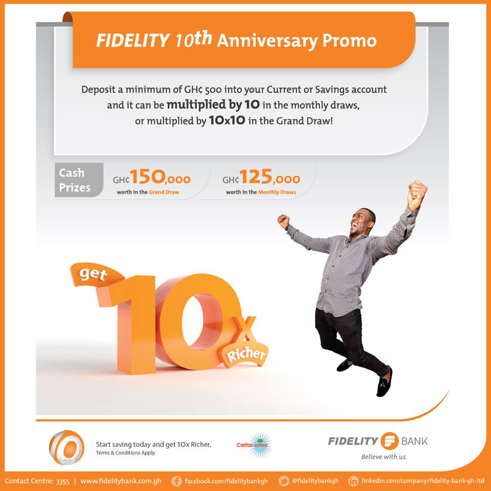 The promotion is part of the Bank’s effort to show appreciation and reward loyal customers as Fidelity Bank marks its 10th anniversary celebrations. Aimed at making customers 10 times richer, the 10x richer promotion will run for a period of 6 months starting from June, 2017 and ending in November 2017.Lucky customers will receive rewards to the tune of GHS 275,000. In each month, 5 lucky customers will win a total of GHS25, 000 (5,000 each) while 3 lucky customers stand a chance of winning 50,000 each in the grand draw in December.