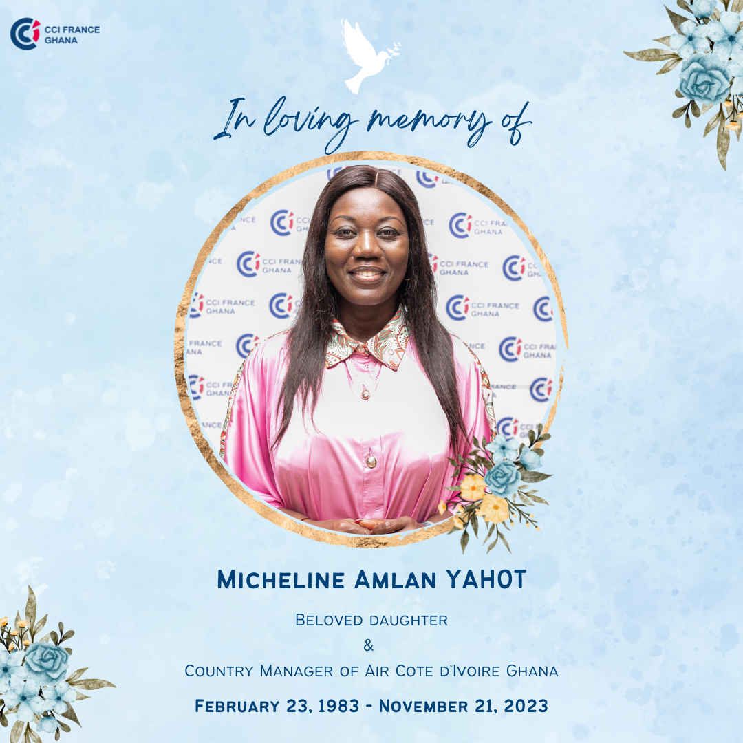 On behalf of the Ayoko Kyeredom family of Accra, CCIFG regrets to inform all members of the passing of the Country Manager of Air Cote d'Ivoire Ghana, Micheline Amlan YAHOT.