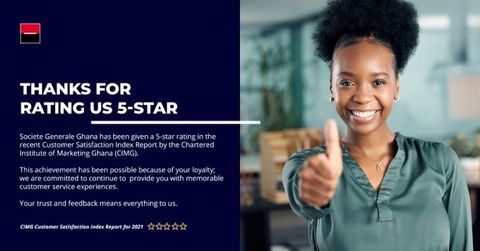 Following the release of the Chartered Institute of Marketing Ghana (CIMG)Customer Satisfaction Index Report for 2021, we are pleased to announce that Société Générale Ghana PLC, achieved a 5-star rating and overall ranking as 3rd best bank in customer satisfaction.